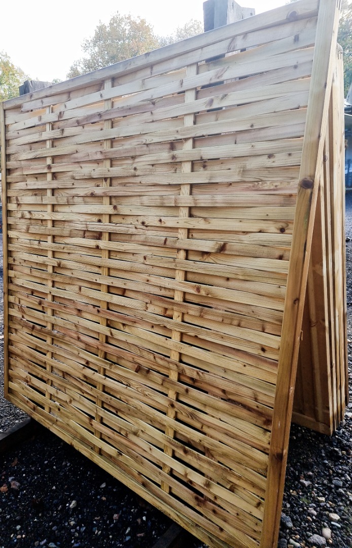 Click on the thumbnail to enlarge. Picket fence panels Picket panels typically a country style fencing have square cut wooden rails, Picket Palin boards evenly spaced & securely fastened to the rails. Palin styles are pointed, rounded or square cut tops. Close Board fence panel A Pressure treated close board panel has a series of 22mm thick wooden palings boards nailed close or touching together onto Square cut pressure treated wooden rails. The palings can either be vertical, horizontal or diagonally fixed. Halve Log fence panels Half log fence palings are halved machine rounded log rounds with the flat cut side nailed to strong square cut rails, evenly spaced along the rail and securely on with stainless steel nails. Lap Panels A series of thin horizontal overlapping wooden boards, nailed between 2 batons which surrounds as a frame. Three batons are evenly spaced across between the frame and nailed to the thin boards Trellis Fence Panel Trellis panels are a series of equally spaced narrow wooden rails set with half laid vertically and the other half laid horizontally and nailed together at the crossing over points. Which fence panels are cheapest Picket panels are the cheapest wooden vented panels and waney lap panels are the cheapest solid fence panel Feather Edge Fence Panel This pressure treated panel has vertical tapered palings which overlap the neighbouring board and nailed after the overlap to square cut fence rails with stainless steel nails. A wooden cap is nailed on the top of the panel to protect the end grain of the palings. Venetian Fence Panels Venetian panels have a tilted horizontal slat to allow privacy & water run off. It gas a full frame 2 vertical rails with incisions in to support the tilted slats. Fence Panels Cheapest types of fence panels, pressure treated, Closeboard, Picket & Decorative fences to buy in Ipswich & England, sizes, strength & cost effectiveness. Fence Panel Sizes British made standard fence panels are 6 feet wide (1828.8mm), continental panel fencing are 1800mm (5 feet 11inches) wide, & bespoke panels are up to 3 metres. Contemporary fence panels Modern type of fence panels for a garden fence with planed wooden horizontal batons, nailed to a ridged wood panel frame and pressure treated.